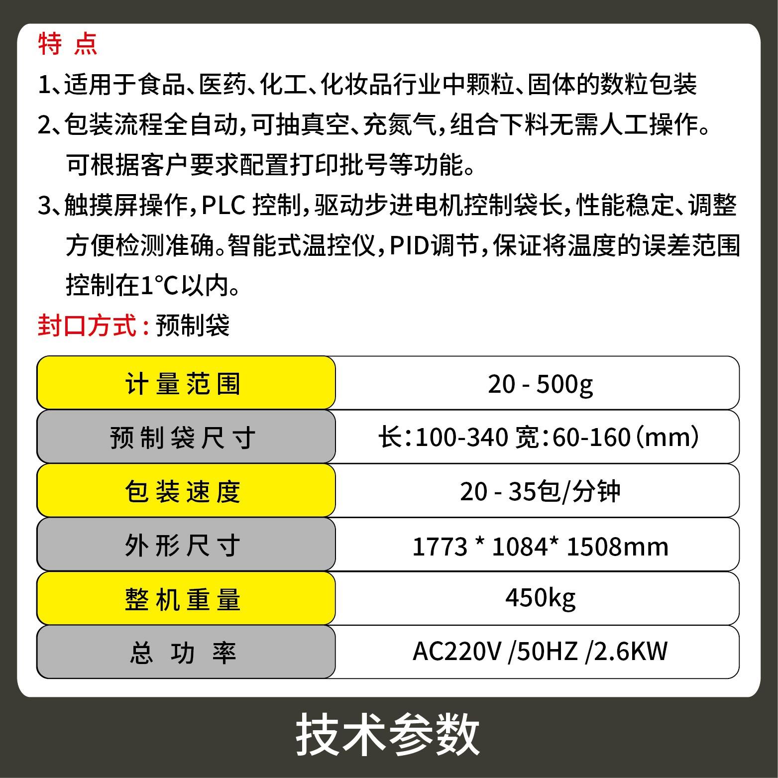 2、包裝流程全自動,無需人工操作,可抽真空、充氮氣,組合下料??筛鶕?jù)充填物料的性質(zhì)選配不同的下料結(jié)構(gòu),且可根據(jù)客戶要求配置打印批號等功能。