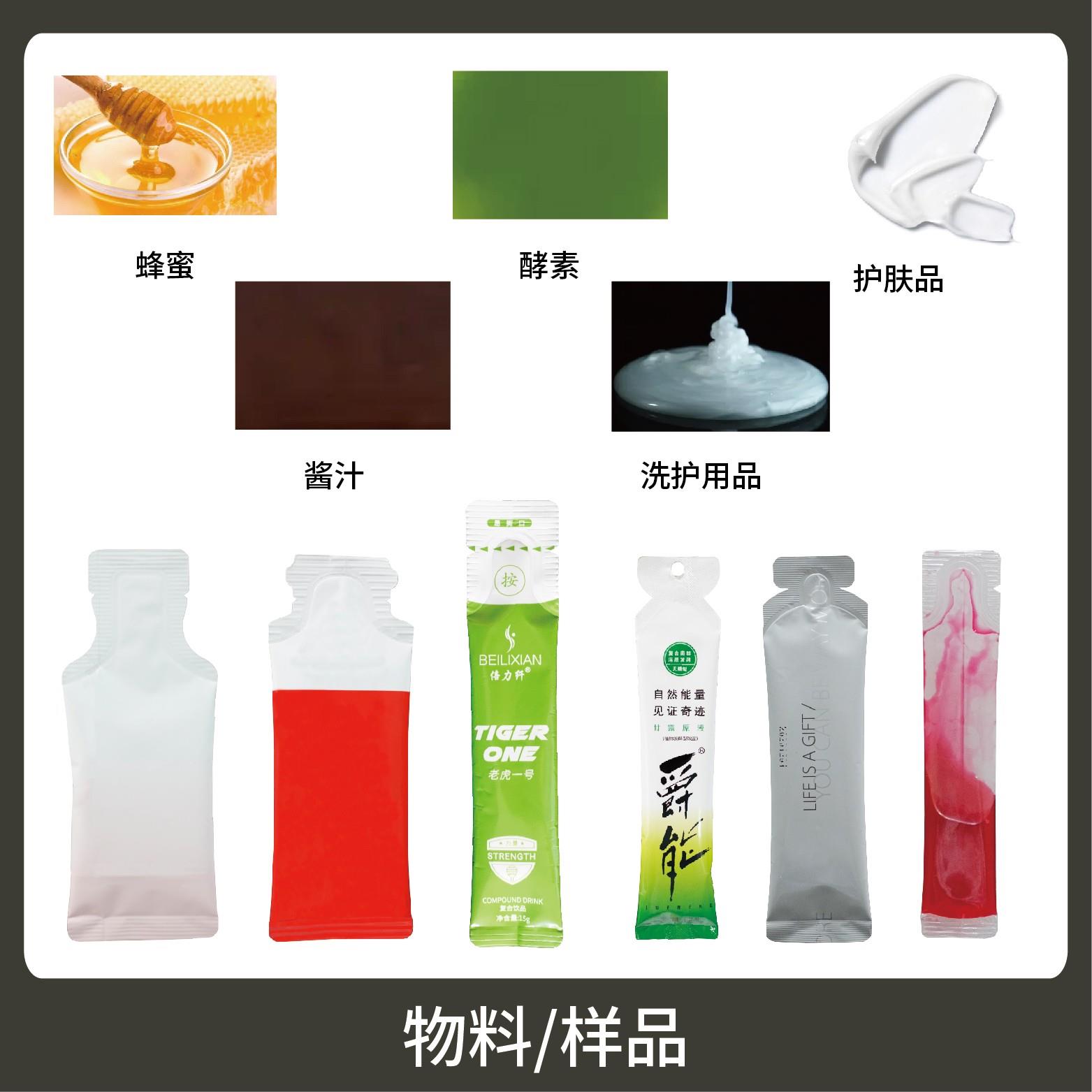 特 點1、適用于各行業(yè)中酵素、果汁、漱口水、洗護用品、染發(fā)劑、化妝品小樣等醬料、液體物品的異形袋計量包裝。